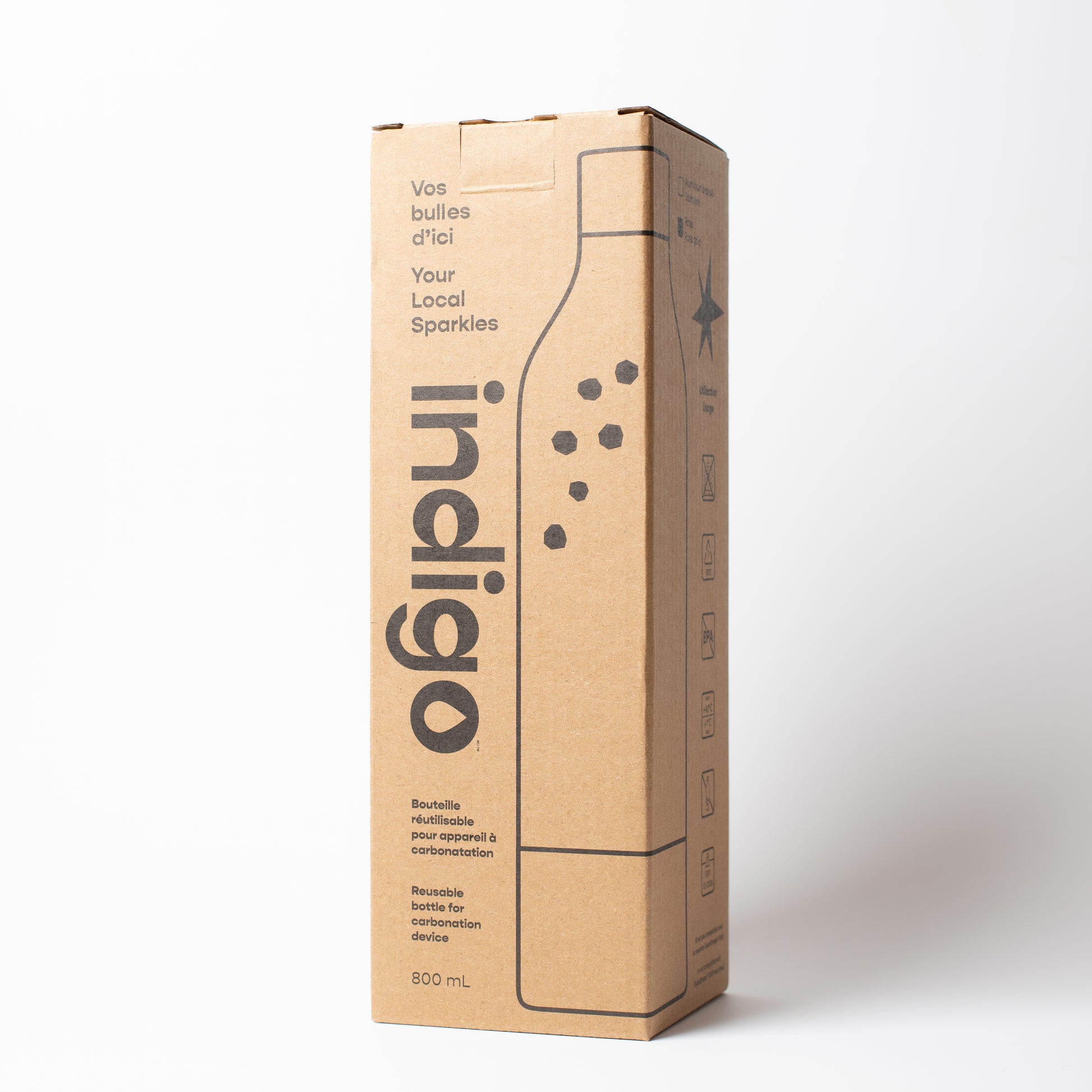 Les bouteilles réutilisables Indigo Soda de 800 ml sont fabriquées en plastique PET de haute qualité, conçu pour résister à la pression répétée de la carbonatation.